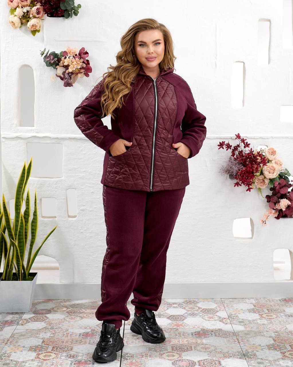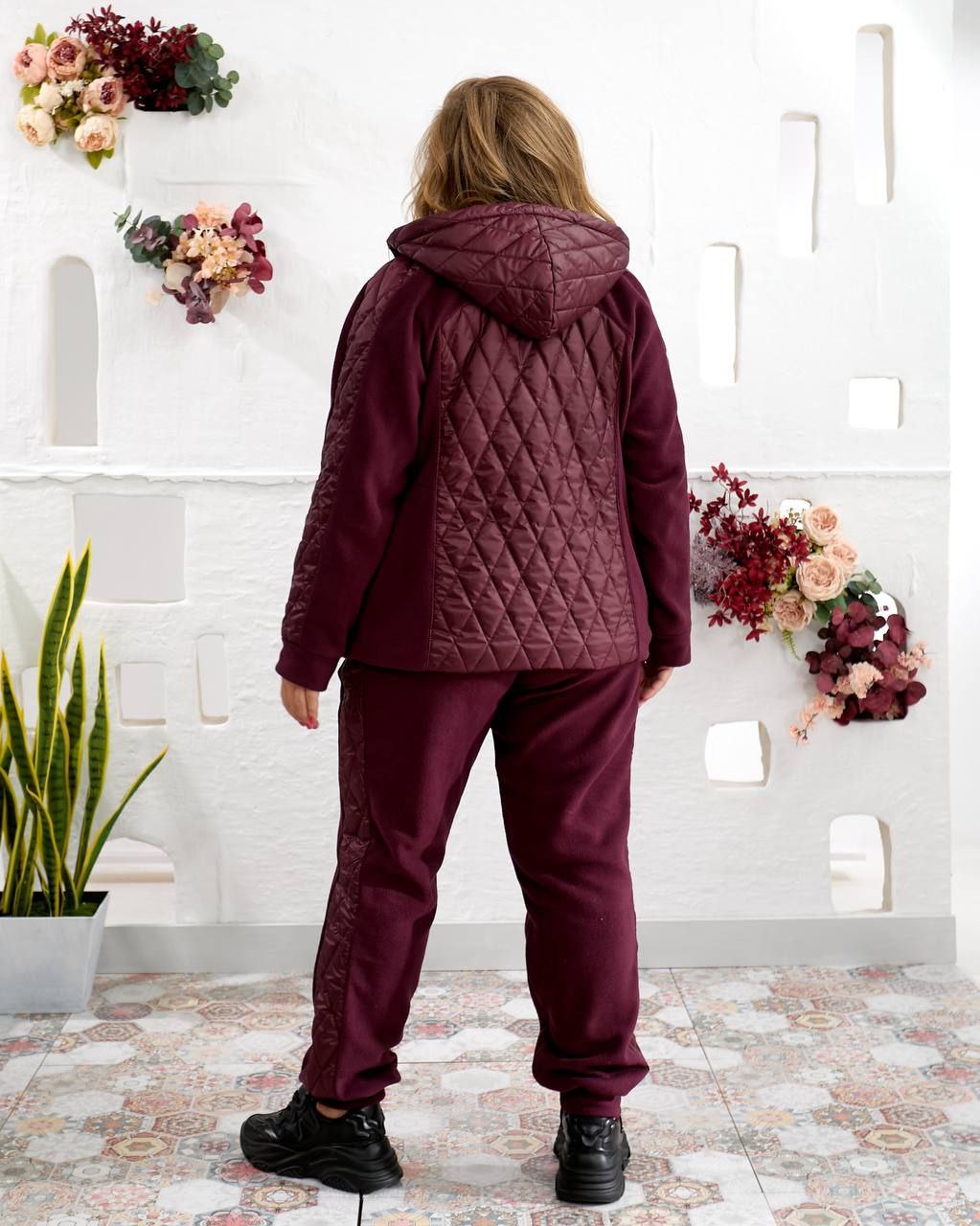 Kombinezon casualowy, kurtka z kieszeniami i kapturem, w całości podszyta. Spodnie z kieszeniami na gumkę.