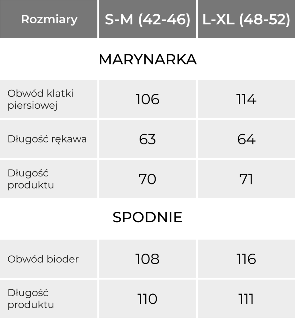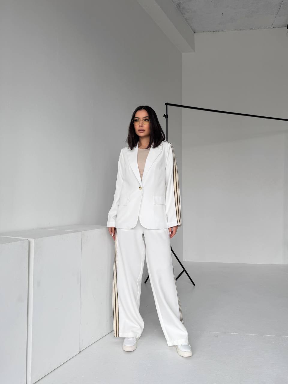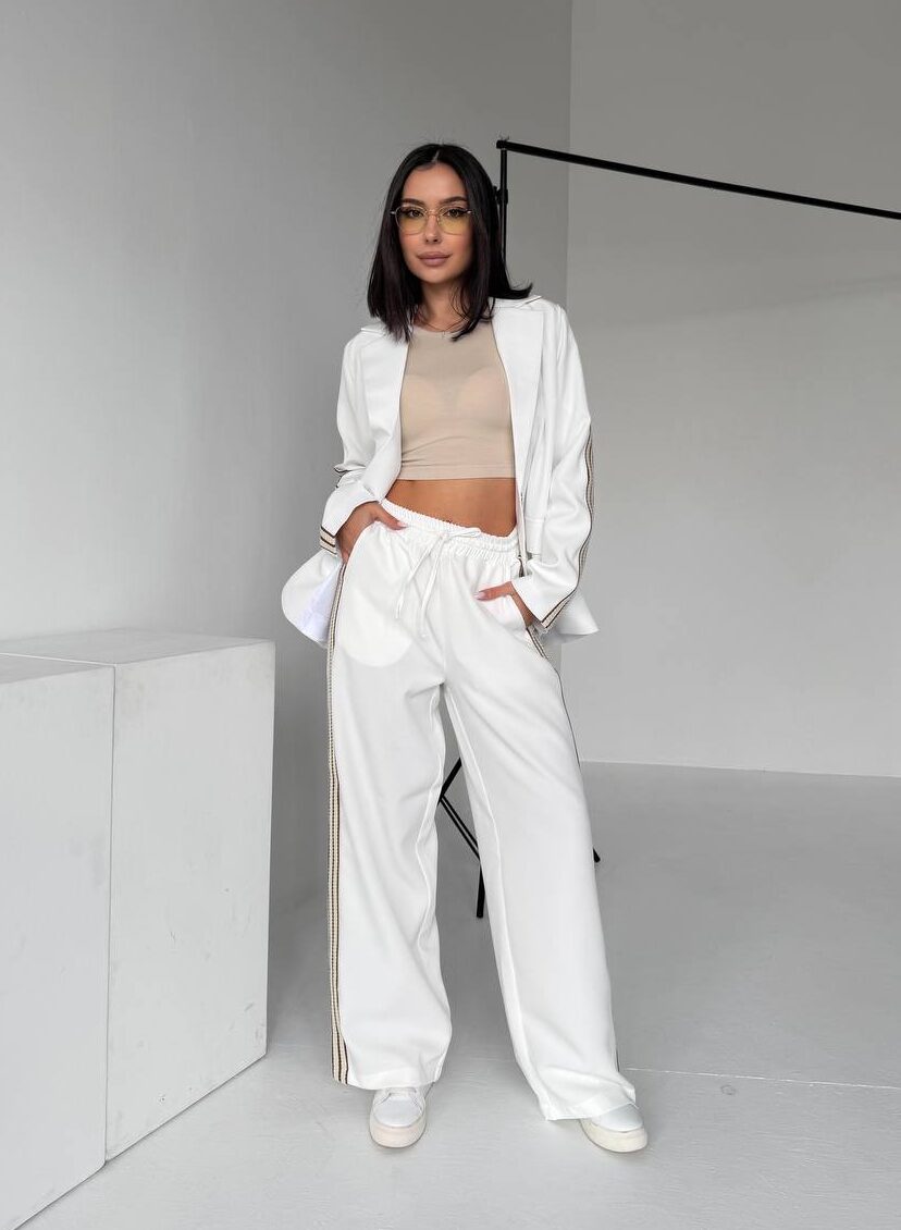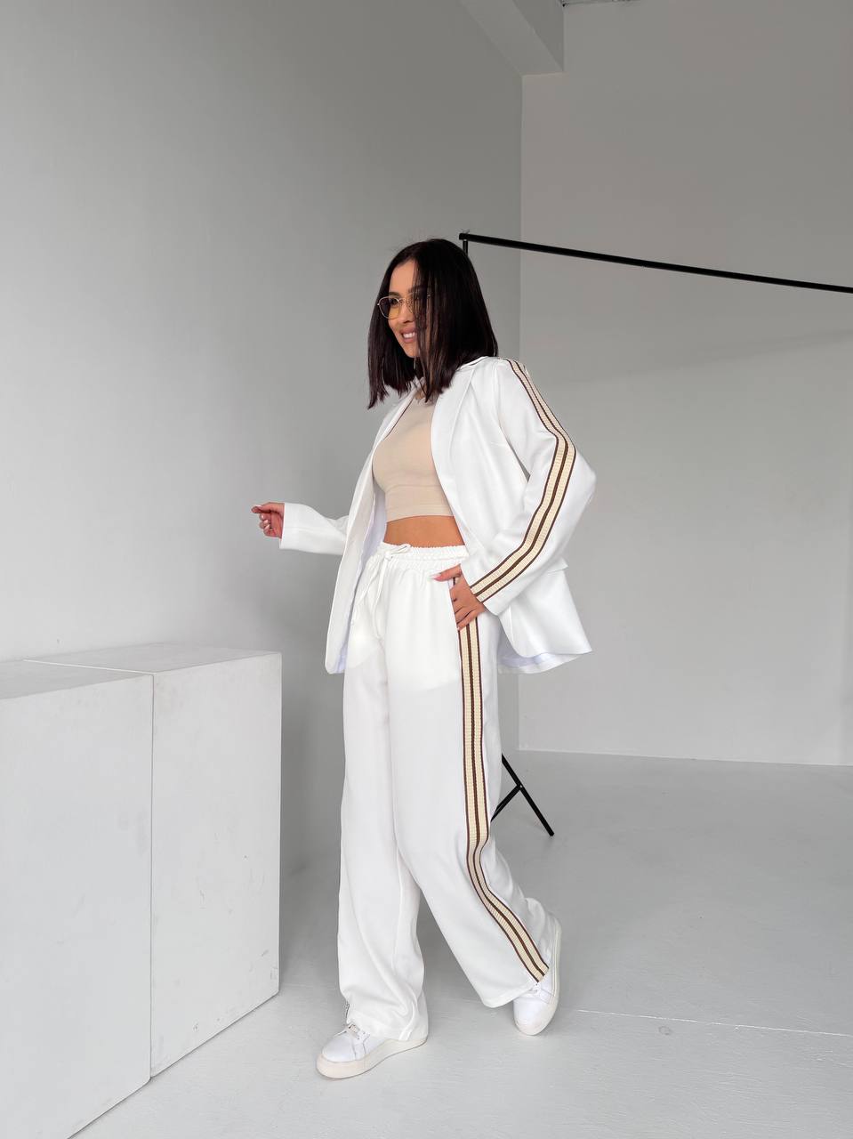Kostium ma luźny krój, łączy elementy klasycznej marynarki z podszewką i lamówki, które dodają modnego akcentu i optycznie wydłużają sylwetkę. Spodnie są szerokie, z kieszeniami , paskiem na gumkę , po bokach również lamówki. Łatwo łączy się z topami, koszulkami, trampkami lub obcasami.