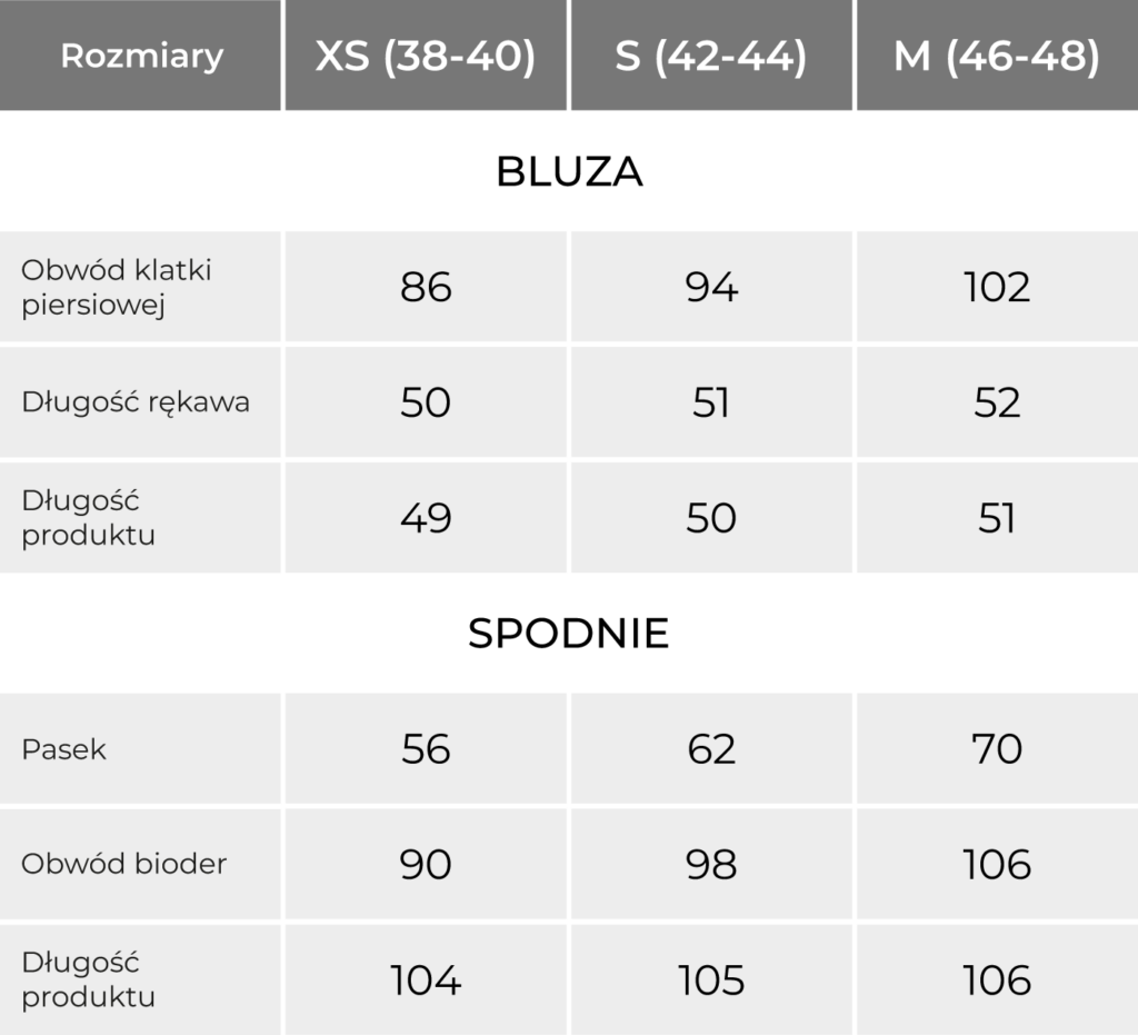 Kostium składa się z krótkiej bluzy z gumką u dołu oraz szerokich spodni z miękką gumką i kieszeniami. Materiał jest przyjemny dla ciała i dobrze trzyma kształt.