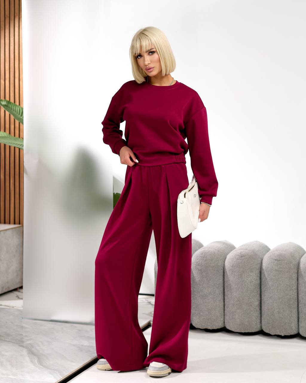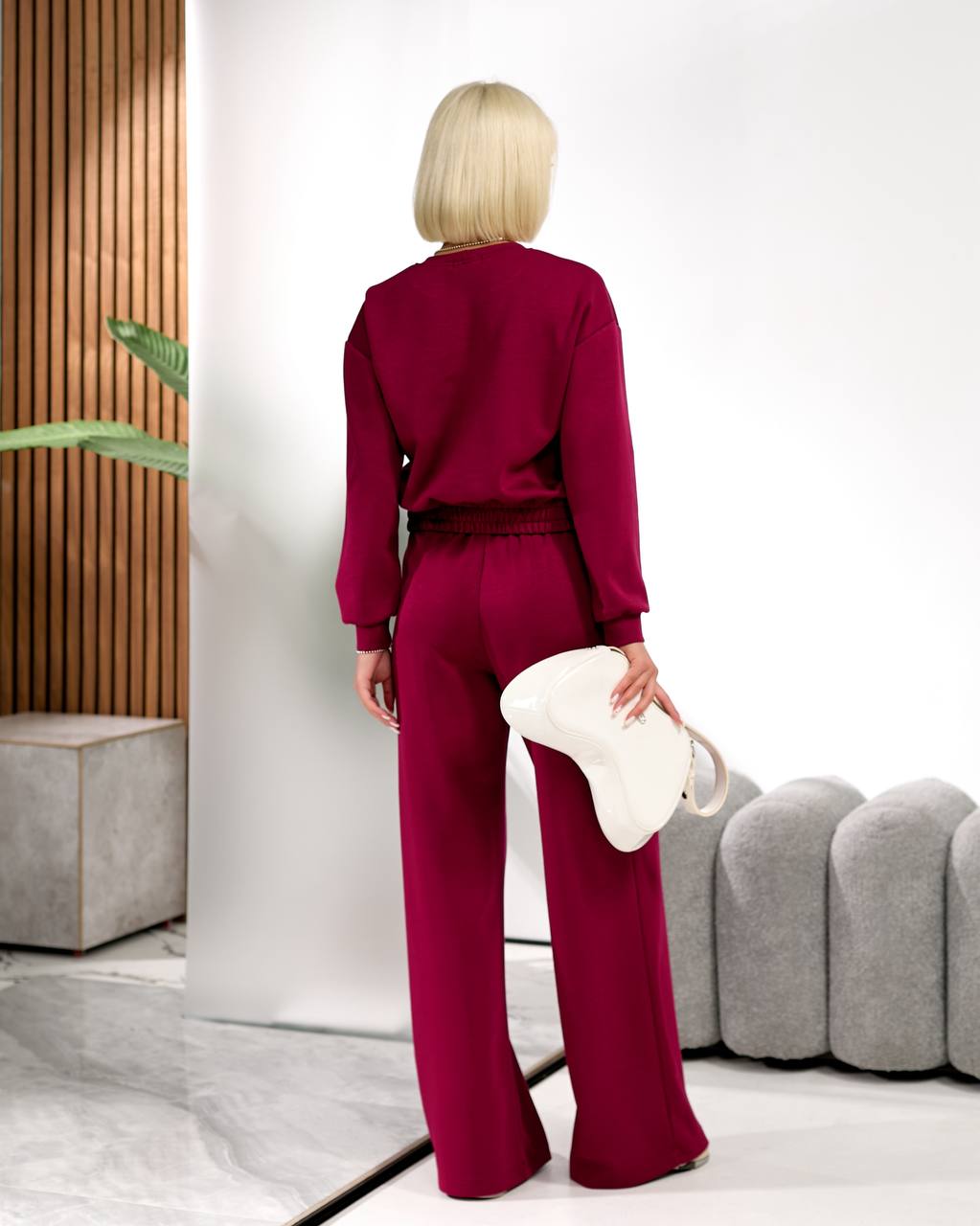 Kostium składa się z krótkiej bluzy z gumką u dołu oraz szerokich spodni z miękką gumką i kieszeniami. Materiał jest przyjemny dla ciała i dobrze trzyma kształt.